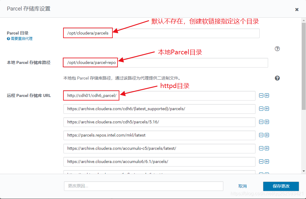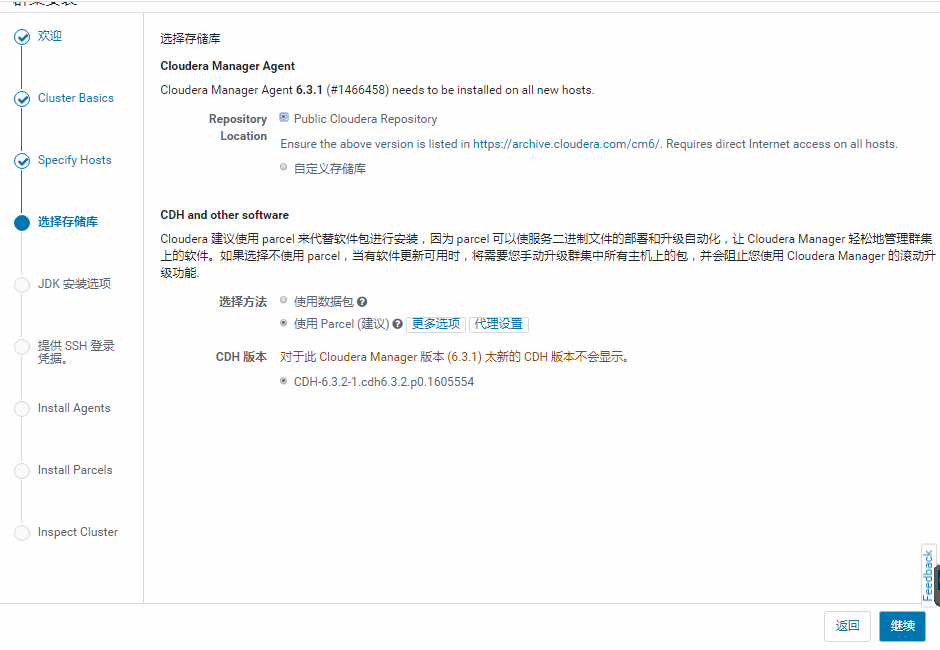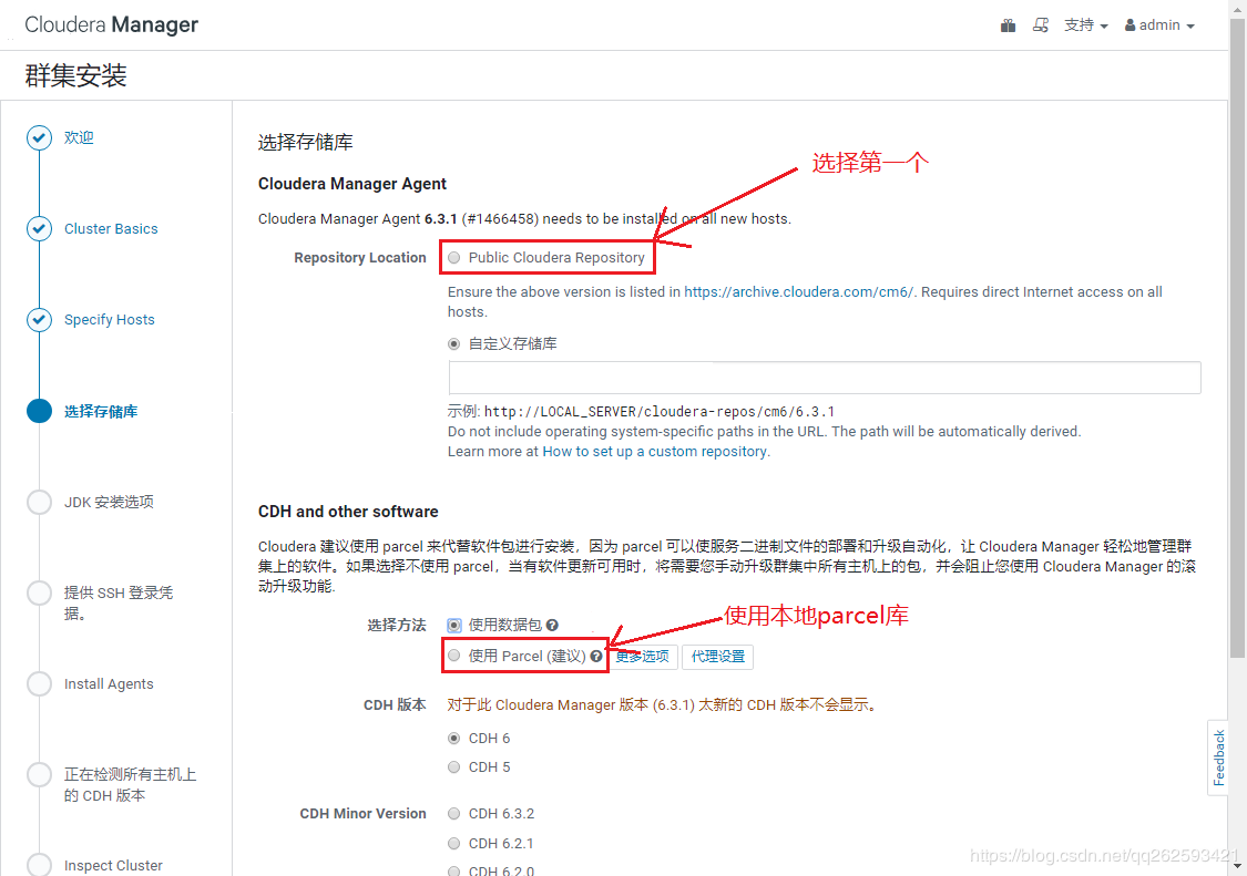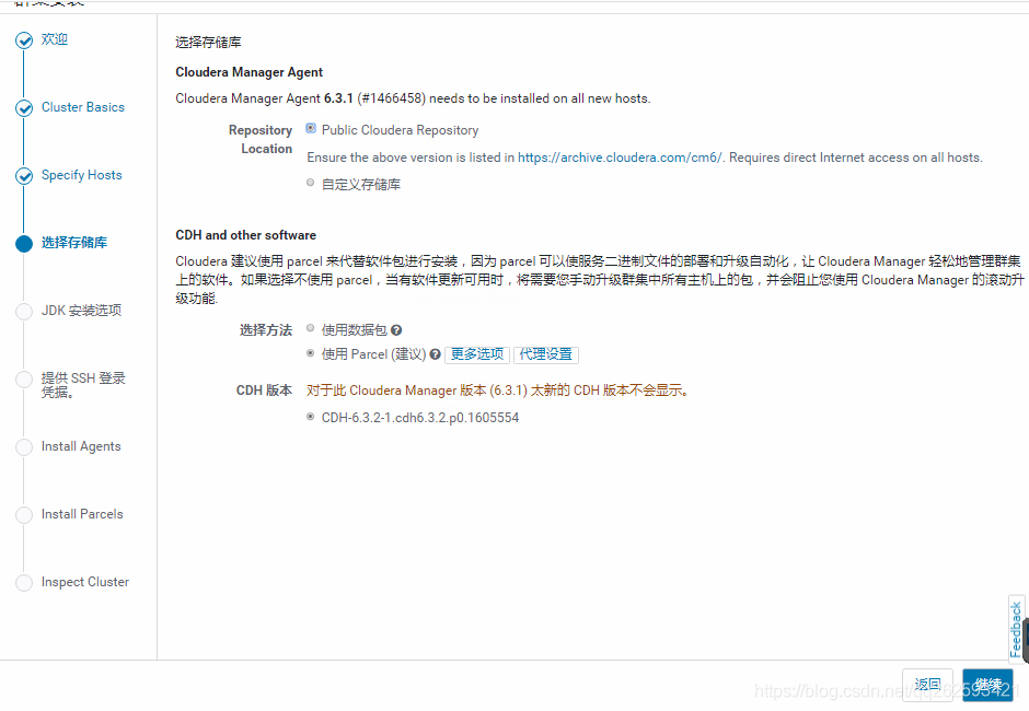 CDH and other software -> 选择方法 -> 使用 Parcel (建议) 更多选项