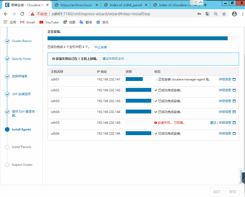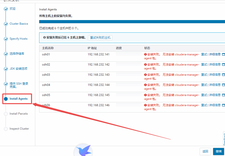 出现了一个节点安装失败,点击重试了很多下都没反应,最后等其他节点安装完很久后