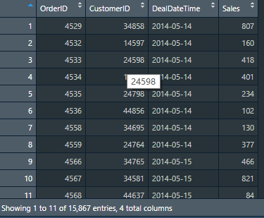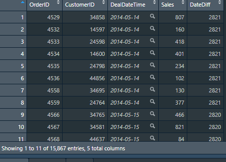 数据第一列为OrderID(订单ID)、第二列为CustomerID(客户ID)、第三列DealDataTime(交易日期)第四列为Sales(交易金额)