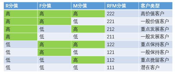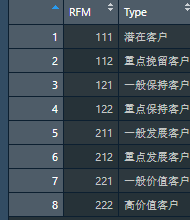 CustomerType = data.frame('RFM' = c(111, 112, 121, 122, 211, 212, 221, 222),'Type' = c('潜在客户', '重点挽留客户', '一般保持客户','重点保持客户', '一般发展客户', '重点发展客户', '一般价值客户', '高价值客户')