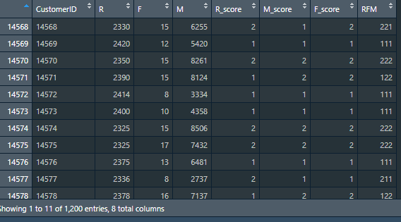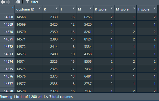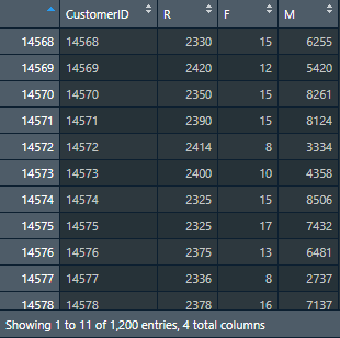RFMData = data.frame('CustomerID' = row.names(R), 'R' = R, 'F' = F, 'M' = M)