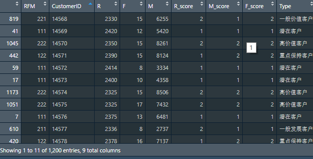 首先将各个RFM综合分值和客户类型的对应关系定义为一个数据框。然后使用merge函数的内连接方法,将RFMData数据框与港定义的RFM综合分值和客户类型的对应关系表,根据管理案例额名RFM匹配合并为一个数据框,这样就完成了客户分类的操作。