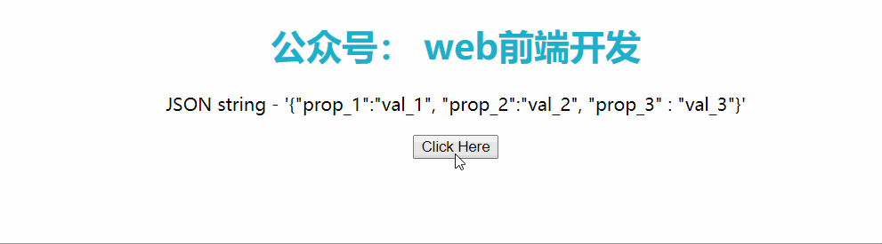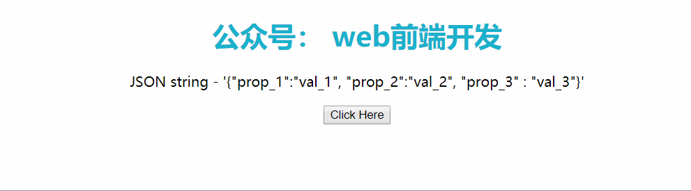 <body style = "text-align:center;"> <h1 style = "color:#1ab1cc;" > 公众号:web前端开发 </h1> <p id = "GFG_UP"></p> <button onclick = "myGFG()"> Click Here </button> <p id = "GFG_DOWN"></p> <script> var up = document.getElementById("GFG_UP"); var JS_Obj = '{"prop_1":"val_1", "prop_2":"val_2", "prop_3" : "val_3"}'; up.innerHTML = "JSON string - '" + JS_Obj + "'"; var down = document.getElementById("GFG_DOWN"); function myGFG() { var obj = eval('(' + JS_Obj + ')'); var res = []; for(var i in obj) res.push(obj[i]); down.innerHTML = "Array of values - [" + res + "]"; } </script> </body>
