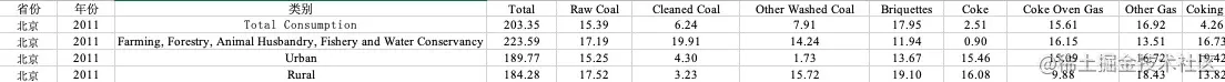 def get_sheet_data(data, sheet_name, year):# 取需要的几行数据df_concat = data[sheet_name].loc[[2,3,48,49]]# 给 Unnamed: 0 列进行重命名df_concat = df_concat.rename(columns={'Unnamed: 0':'类别'})# 插入两列数据 省份 年份df_concat.insert(loc=0,column='省份',value=sheet_name)df_concat.insert(loc=1,column='年份',value=i)# 将Total这列移动到第四列df_temp = df_concat['Total']df_concat = df_concat.drop(['Total'],axis=1) # 先删除该列df_concat.insert(loc=3,column='Total',value=df_temp) # 然后插入到第四列位置return df_concatfor sheet_name in list(data.keys()):if sheet_name == 'Sum':continuedf_temp = get_sheet_data(data, sheet_name, year)df_concat = pd.concat([df_concat, df_temp])