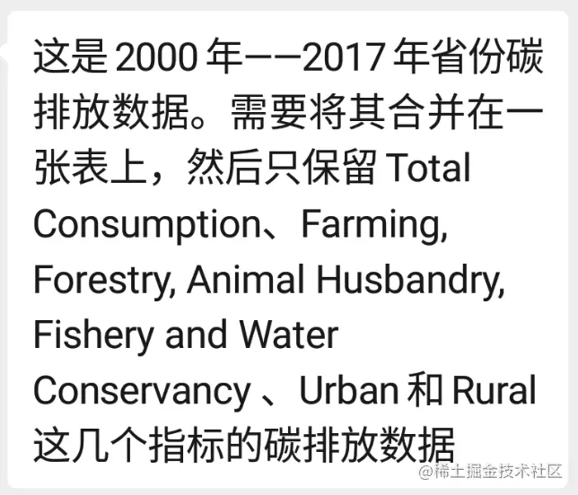 首先我们先看第一个读者的需求:原始数据有18个Excel文件,每个Excel文件里有34个sheet(34个省的相关数据),需要取出每个sheet中指定的几行数据,然后全部合并起来,存储到一个新的文件,命名为2000_2017年各省份碳排放数据。