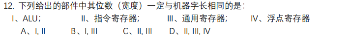 【答案】B【解析】基础概念题机器字长:是指计算机进行一次整数运算所能处理的二进制的位数,通常与CPU的寄存器位数,加法器有关。ALU:算术逻辑单元:实现算术运算和逻辑运算的组合逻辑电路。指令寄存器:暂存当前正在执行的指令。单字长/多字长。通用寄存器:用于传送数据,也可以参与算术逻辑运算并保存结果。浮点寄存器:用于处理浮点运算。