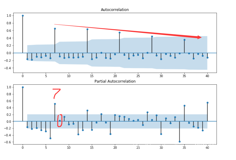 或者是由显著非0的(偏)自相关系数衰减为小值波动的过程比较缓慢或非常连续