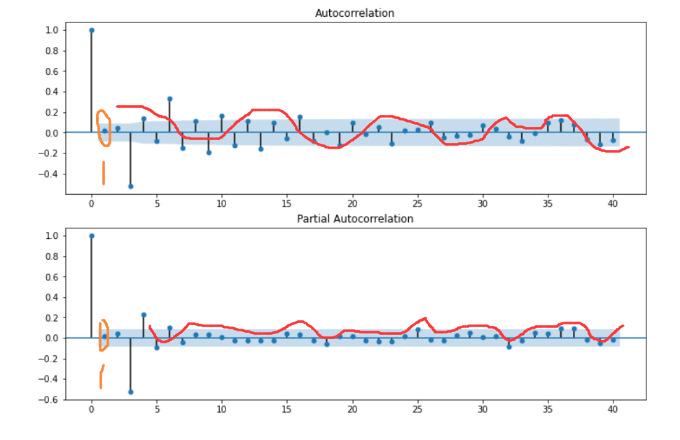 我们不能在这里使用ACF图,因为即使对于过去很久远的滞后项,它也会显示出良好的相关性。如果我们考虑了这么多特征,我们将遇到多重共线性问题。这对于PACF图来说不是问题,因为它删除了之前滞后已经解释的成分,因此我们只得到了与残差相关的滞后,比如未被较早的滞后项所解释的成分。