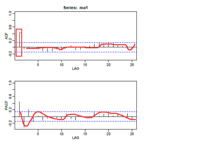 这样的图,可以看到PACF是拖尾,ACF自1阶过后都落在2倍标准差范围内,所以是MA(1)模型。