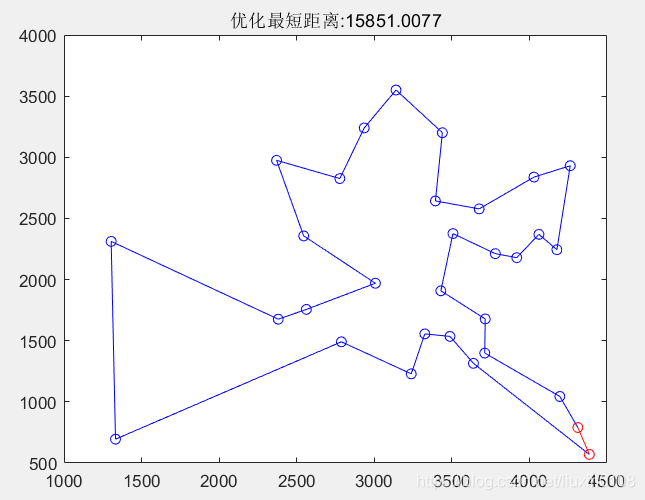 C = [1304 2312;3639 1315;4177 2244;3712 1399;3488 1535;3326 1556;...3238 1229;4196 1044;4312 790;4386 570;3007 1970;2562 1756;...2788 1491;2381 1676;1332 695;3715 1678;3918 2179;4061 2370;...3780 2212;3676 2578;4029 2838;4263 2931;3429 1908;3507 2376;...3394 2643;3439 3201;2935 3240;3140 3550;2545 2357;2778 2826;...2370 2975]; %31 个省会城市坐标