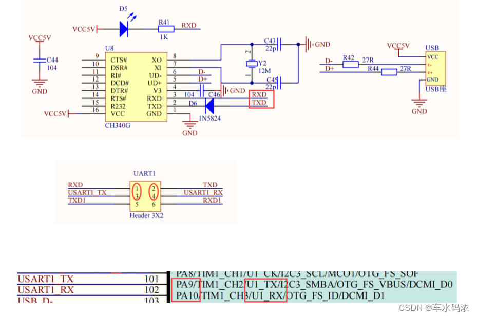 USB调试口连接到了CPU的PA9 PA10,它们具有串口复用的功能