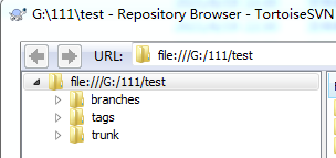 创建一个空文件夹,进入文件夹,单击鼠标右键- >TortoiseSVN -> Creat Repository here,在弹出的窗口中点击“Create folder struct”,之后选择“确定”和“OK”即建立了一个版本库(如下图该库的访问路径为file:///G:/111/test)。单击鼠标右键->TortoiseSVN -> Repo-browser会自动弹出版本库的路径及相关内容。