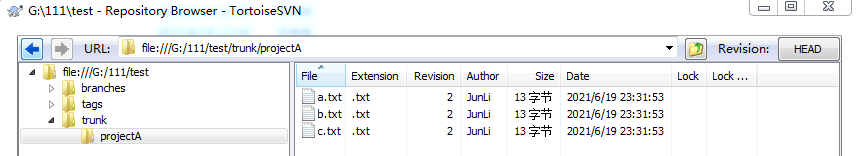 将G:\111\projectA放入库的trunk下,选中trunk(参考建立版本库章节的第二张图) -> 单击鼠标右键 -> Add folder… ->选中G:\111\projectA -> 确定,此时G:\111\projectA下所有文件都纳入了版本管理之中。