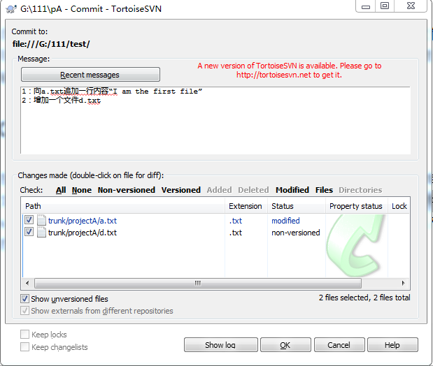 在Checkout之后,如果文件有修改则需要commit才能同步到版本库中,比如在G:\111\pA文件夹,向a.txt追加一行内容“I am the first file”,同时增加一个文件d.txt并添加内容“this is d.txt”。进入文件夹->单击鼠标右键 -> SVN Commit -> 选择改动过的文件->写入改动日志(log)->OK,如下图所示,此时即可将改动保存到版本库中。