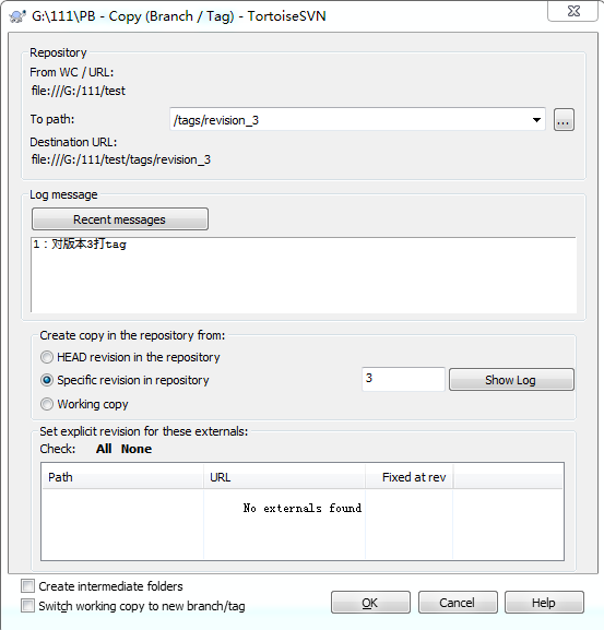 有时候可能需要将一个功能完整的版本留作备份(tag),或者用于开发其他新增的功能(branch,待该功能稳定之后再合并到trunk中)。进入文件夹->单击鼠标右键 ->TortoiseSVN->Branch/tag...->填写”To path”的值,比如/tags/revision_3(对版本3打tag,由下图中的“Specific revision in reposipory”)->OK,即可在版本库tags文件夹下创建xxx文件夹并且其内容与指定版本的内容一样。