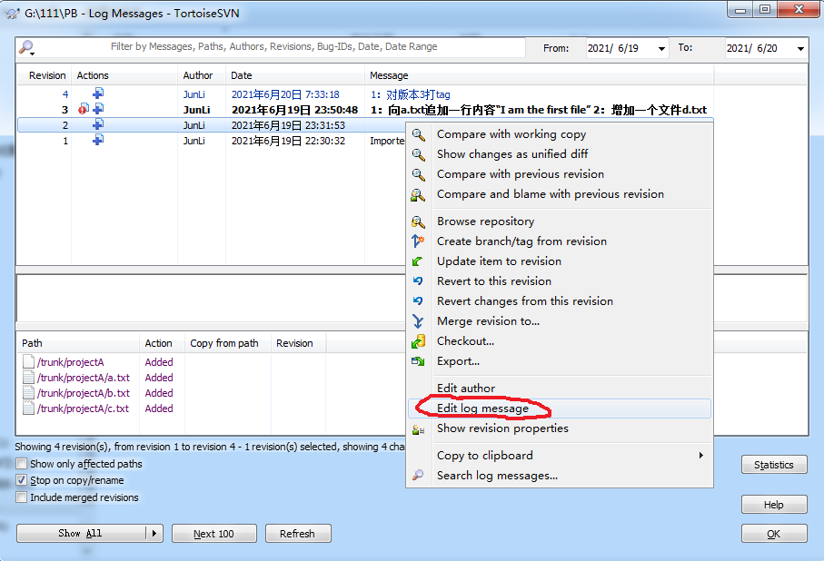 进入文件夹->单击鼠标右键 ->TortoiseSVN -> Show log -> 选定Revision -> 右键单击 -> Edit log message->输入内容->确定。