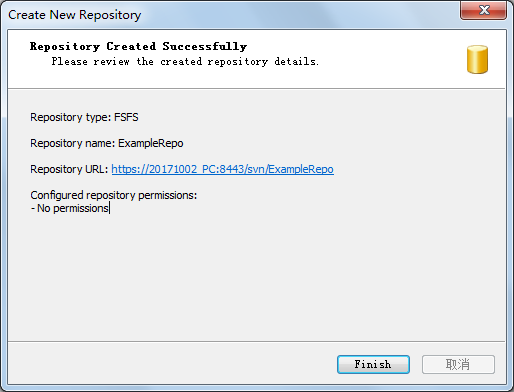 进入上图中Repositories指定的文件夹->单击鼠标右键->Cteate New repository->Regular FSFS repository->填入库文件名字(如ExampleRepo)->Single-project repository->Nobody has access->Create->Finish,此时弹出库的URL,通过VisualSVN Server操作界面右键也可获取库的URL。
