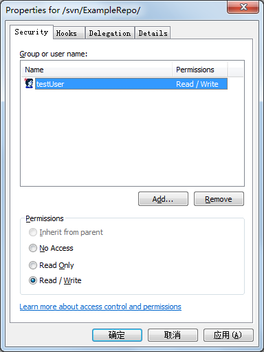 Repositories->ExampleRepo->Properties->Security,如下图,给用户添加用户testUser并给予读写版本库的权限。