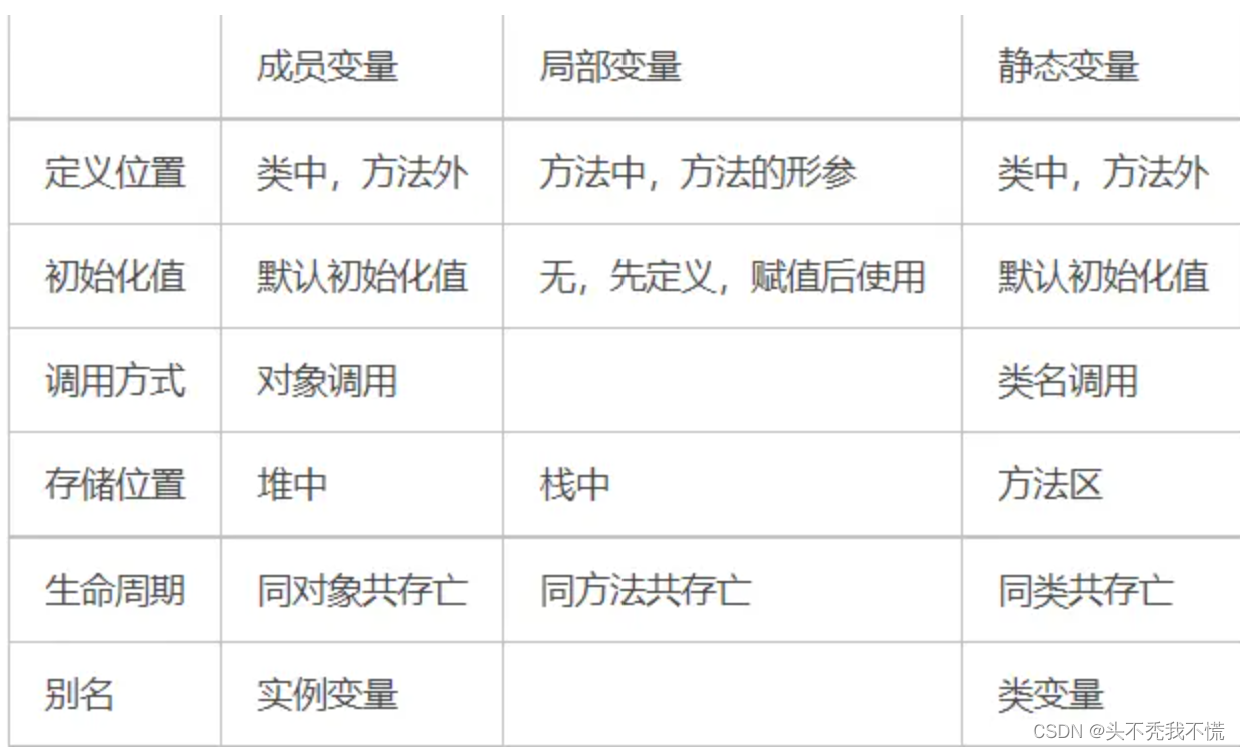 静态变量(类变量) | 用 static 修饰 | 类名.变量名或对象名.变量名 | 其生命周期取决于类的生命周期。类被垃圾回收机制彻底回收时才会被销毁 |