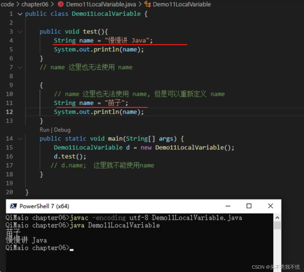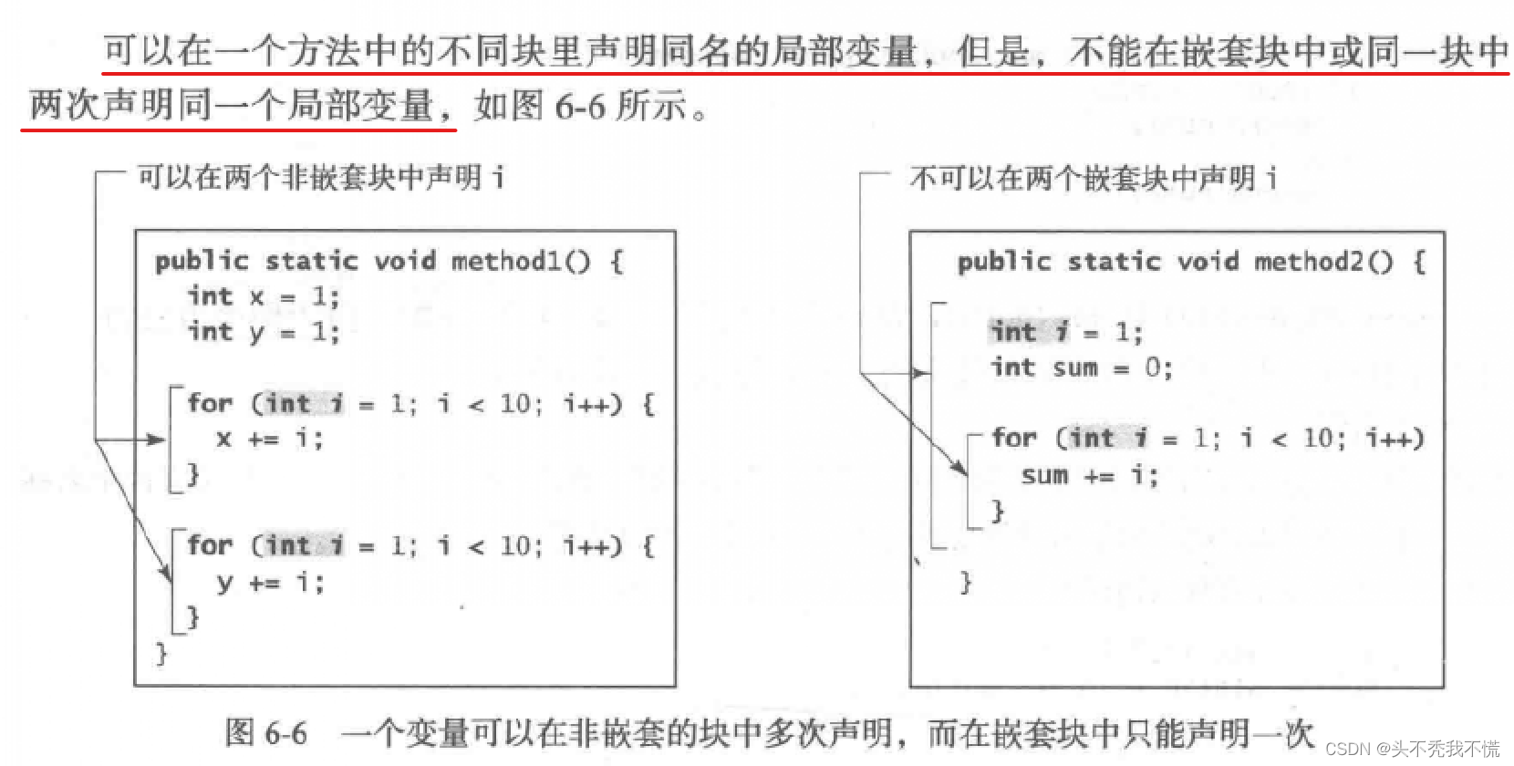 不管是块也好 或方法也好,定义的局部变量就只有对应的花括号的作用域