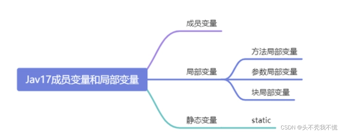 3、成员变量又分为:实例变量和类变量。类变量:static修饰的变量。代码中的实例变量、类变量、常量都属于成员变量,一般情况下说"成员变量"实际是在说"实例变量"