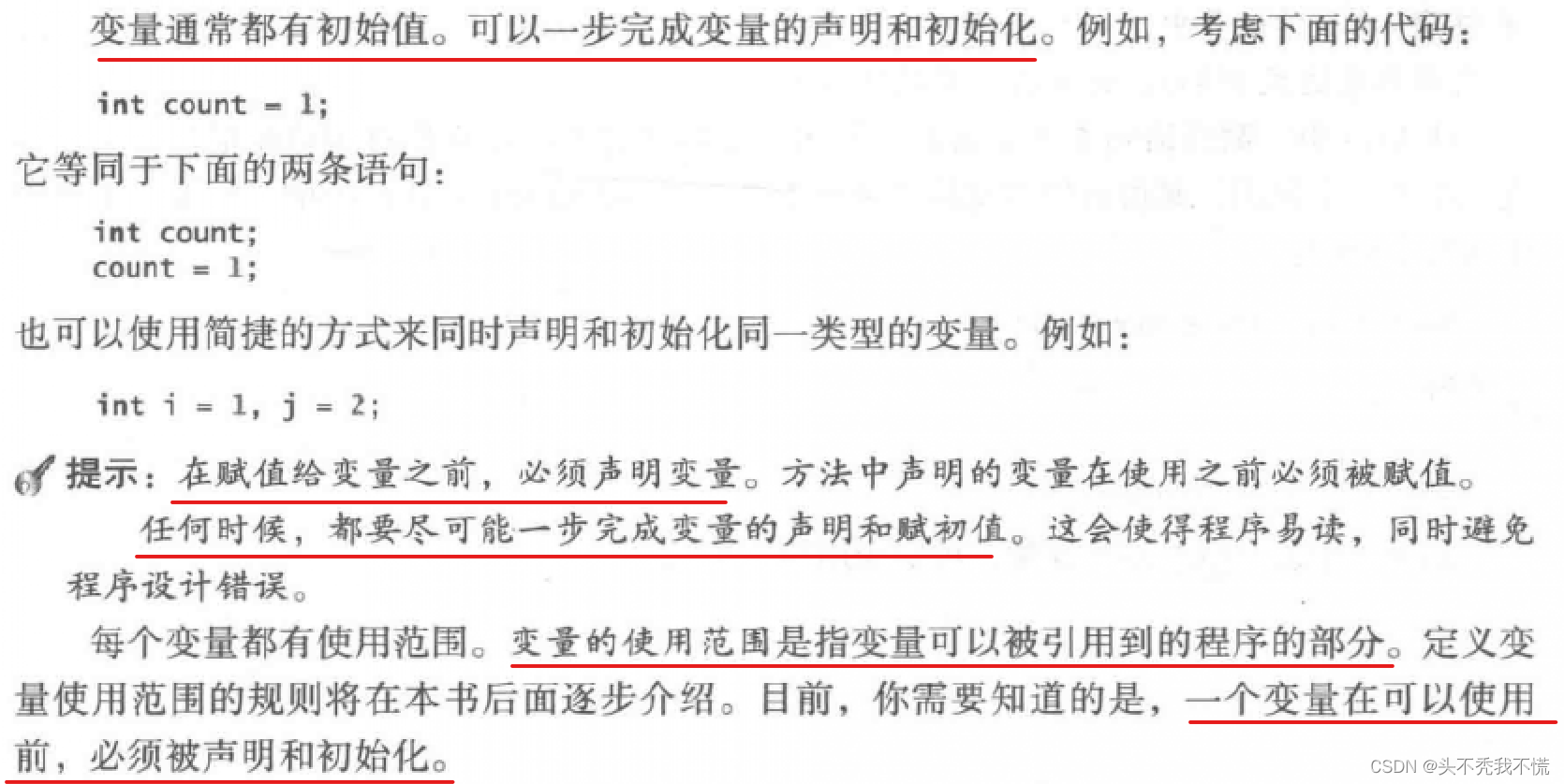- 方法局部变量(方法内定义): 从定义这个变量开始到方法结束这一段时间内有效