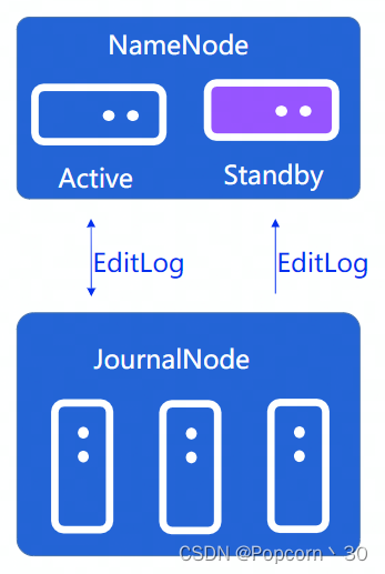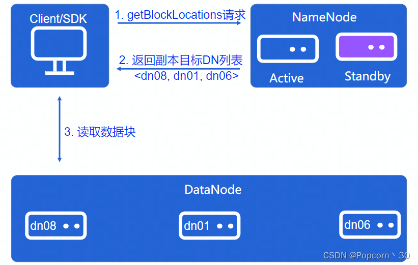Client/SDK <-> NameNode(Active/Standby) <-> DataNode