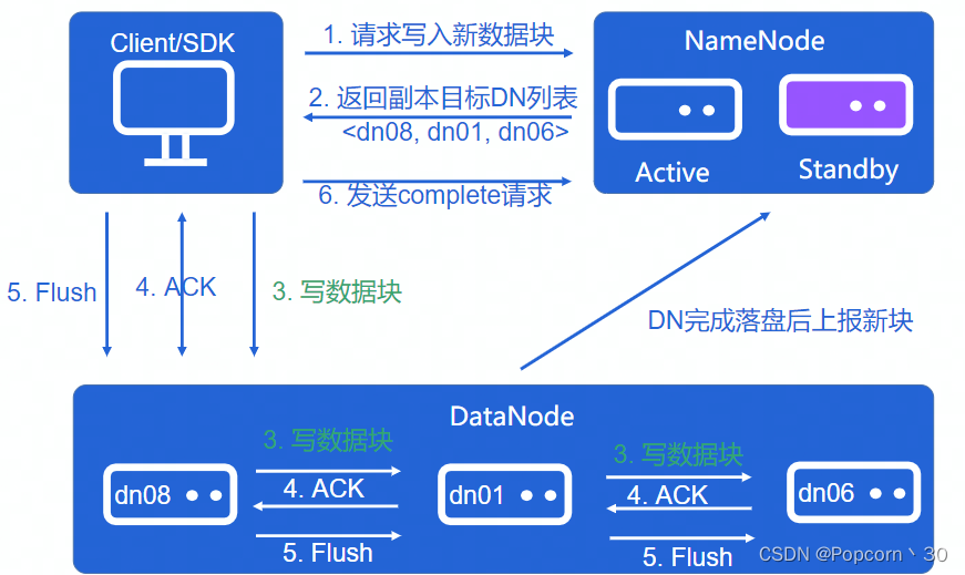 - Client接着对DataNode发送Flush刷新指令,并发送complete完成请求