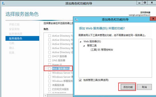 (3)点击下一步,在选择服务器角色面板上,选中 Web 服务器(IIS),并在弹出的添加角色和功能向导对话框上,点击添加功能,点击下一步