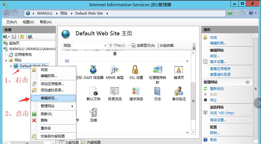 在 Internet Information Services(IIS)管理器界面上,依次点击连接窗格中的计算机名-> 网站->Default Web Site,右击选择‘编辑绑定’,打开后点击右侧添加按钮,类型选择 https,SSL 证书选择刚才申请的自签名证书,点击确定。