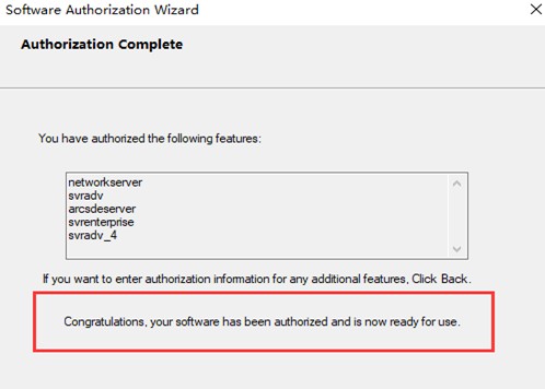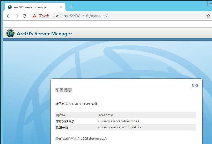(6)出现 Congratulations 说明授权成功,点击完成。之后浏览器自动打开server的站点创建界面,也可通过在浏览器中输入https://localhost:6443/arcgis/manager,创建站点。
