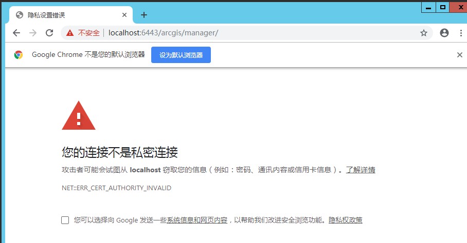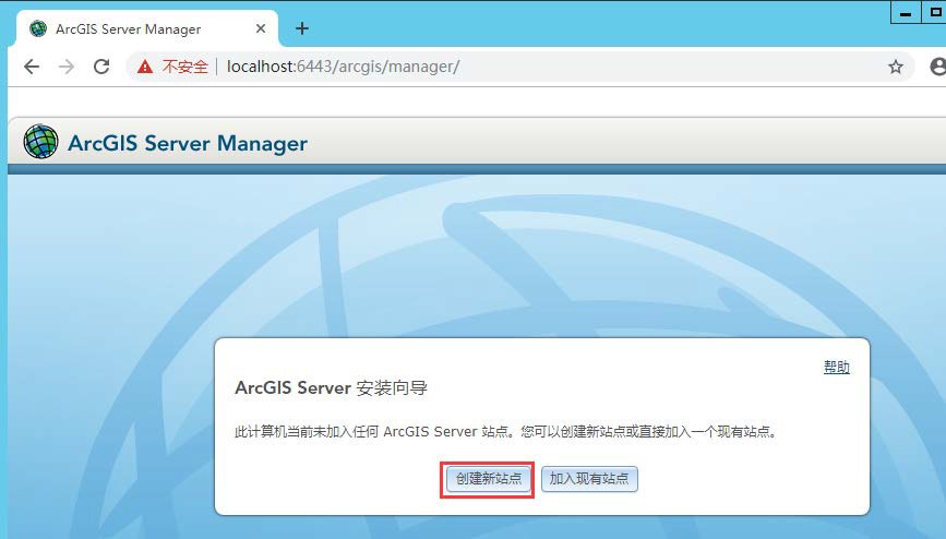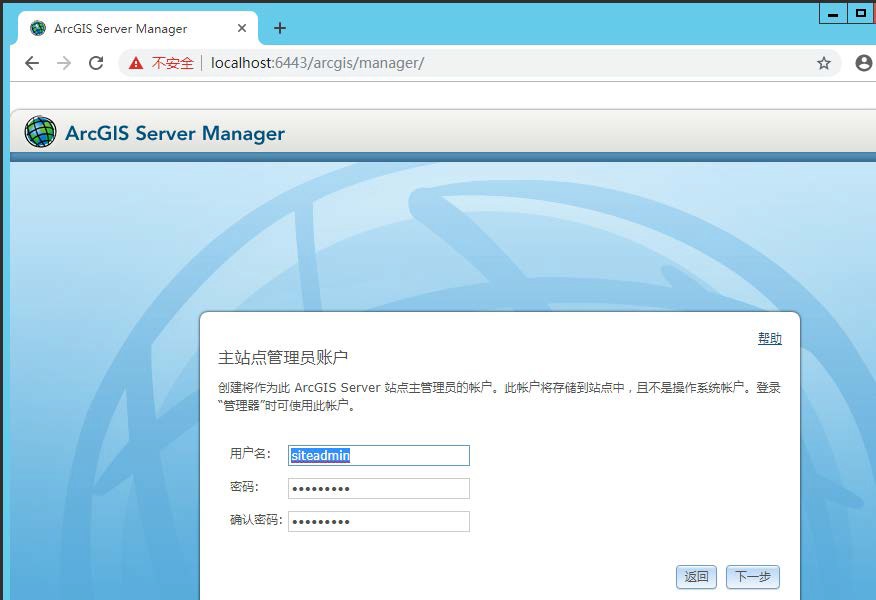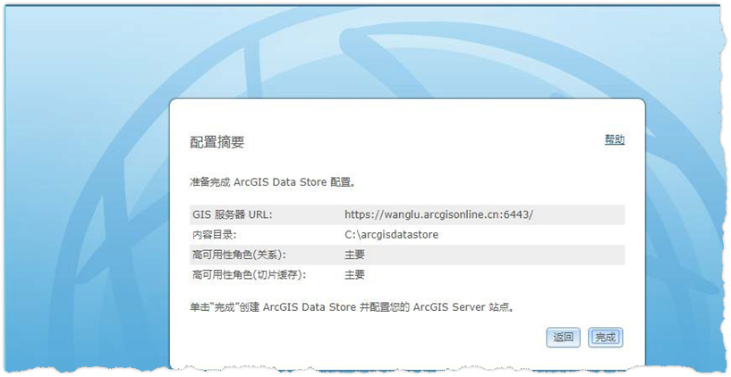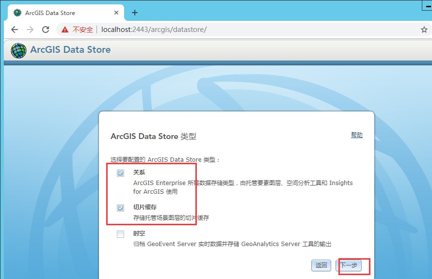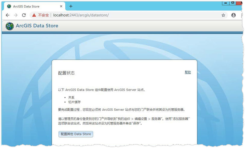 安装完毕后,浏览器自动打开 ArcGIS Data Store 的配置页面。也可通过在浏览器中输入 https://localhost:2443/arcgis/datastore 打开配置页面。