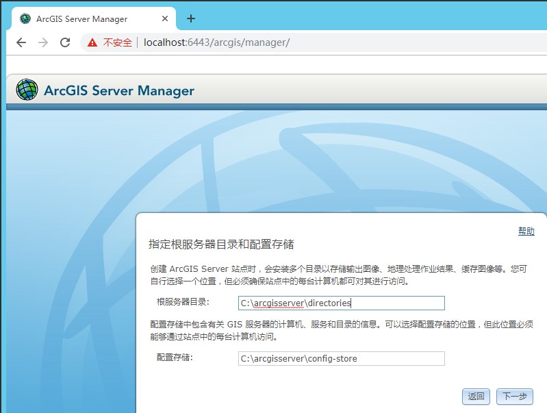 (4)指定根服务目录和配置存储,点击下一步(此处默认,也可以更改至其他盘比如 E:\arcgisserver\directories,服务目录和存储目录也记在记事本上)