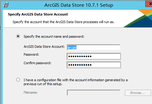 (4)指定 ArcGIS Data Store 账户,ArcGIS Data Store 的所有进程都以此账户身份运行。您可通过指定一个新的账户名和密码在操作系统上新建这一账户; 也可直接使用一个现有的操作系统账户。这一账户可与 ArcGIS for Server 账户相同,也可根据需要设置其他账户。