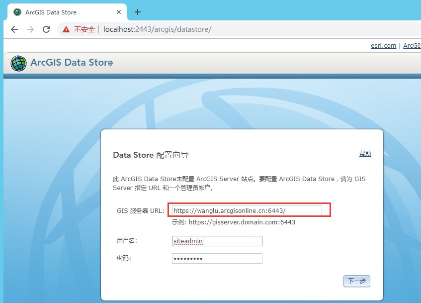 在自动弹出的 ArcGIS Data Store 界面上,点击继续浏览此网站。输入 GIS 服务器 URL,ArcServer 主站点的管理员用户名和密码(URL 地址和账户信息务必输入正确),然后点击下一步。