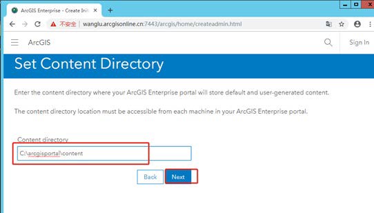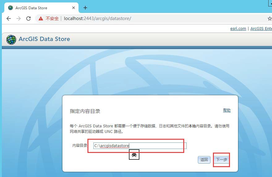 指定内容目录,如果空间不足(托管的服务数据会在这里存储,特别是三维数据,所以后面使用时会需要很多的空间),也可以指定一个所在盘空间比较大的本地内容目录,比如 E:\arcgisdatastore,然后点击下一步。