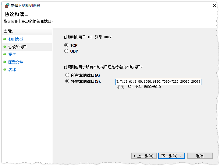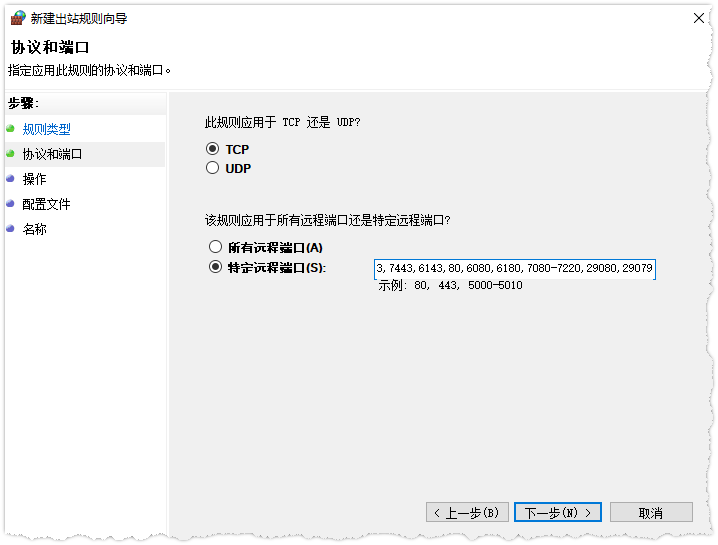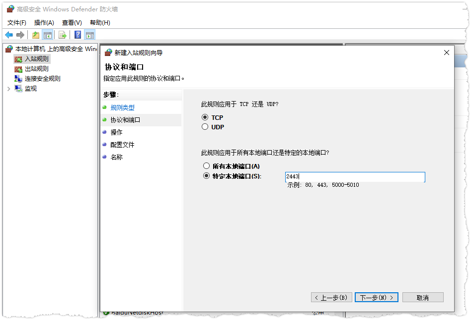 将以上端口加入防火墙出站和入站规则,规则为允许端口通过公众网、专用网、私网规则。
