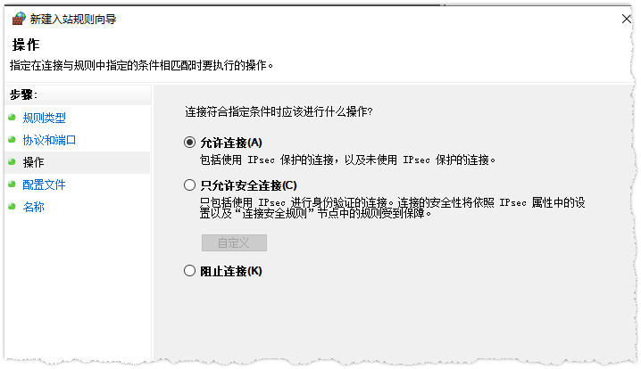 在“操作”中选择“允许连接”,下一步
