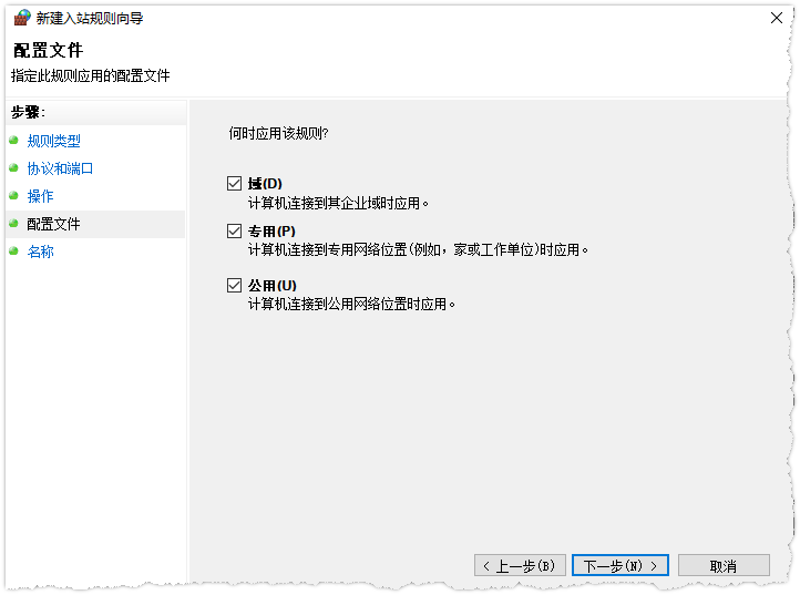 在“配置文件”中,为“应用该规则”做选择,全选,下一步: