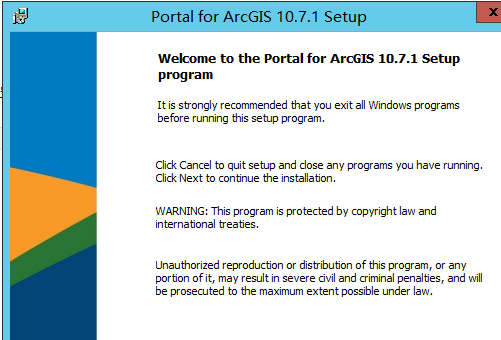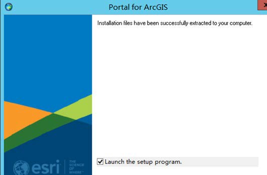 (1)双击步骤 1.4 中准备的 Portal_for_ArcGIS_Windows_1071_169688.exe 开始安装包的提取,之后在安装界面上默认勾选 Launch the setup program,点击 close 即进入 Portal for ArcGIS 的安装。