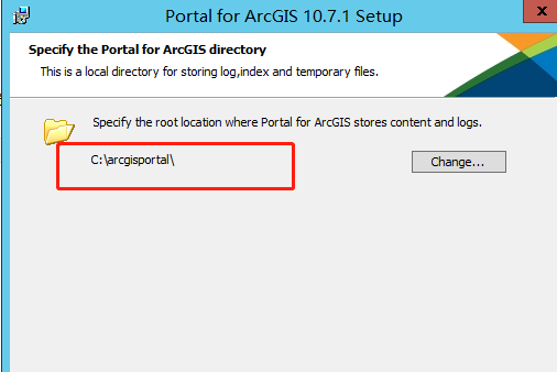 (4)设置 arcgis portal 目录,点击 Next,若空间不足,可以放在其他如E:\arcgisportal