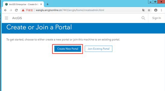 6)点击 Finish ,浏览器自动打开 Portal for ArcGIS 的配置界面。您也可通过在浏览器中输入 https://wanglu.arcgisonline.cn:7443/arcgis/home/ ,打开 Create Or Join a Portal 配置页面