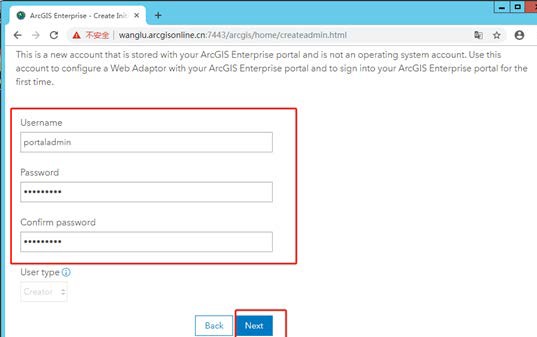 (2)设置 portal 初始管理员账户,输入用户名和密码后,点击 Next,此非常重要,请牢记密码
