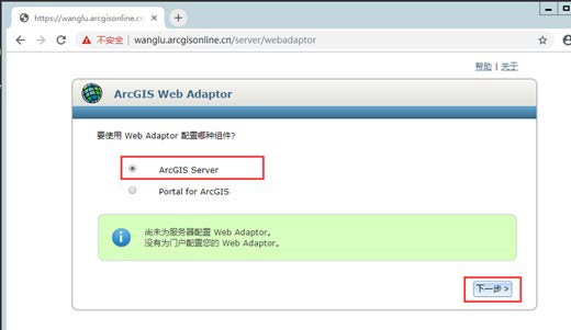 (1)首先在浏览器输入 https://计算机名/webadaptor 起的名字/webadaptor。(软件安装完成后也会自动弹出该页面),然后选择 ArcGIS Server(默认),点击下一步。