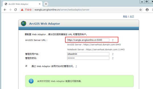 (2)仿照输入框下方的示例输入 ArcGIS Server URL,然后输入 Server 站点的管理员用户名和密码,勾选上‘通过 Web Adaptor 启用对站点的管理访问’(默认),点击配置