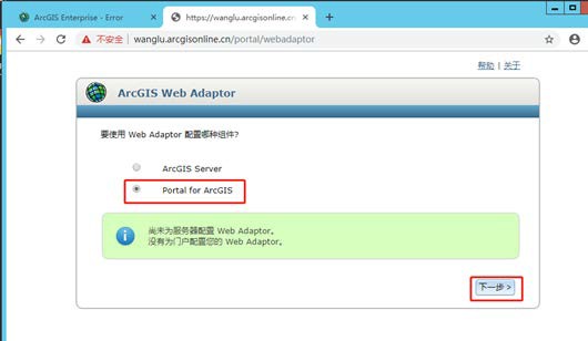 (1)首先在浏览器输入 https://计算机名/webadaptor 起的名字/webadaptor。(软件安装完成后也会自动弹出该页面),然后选择 Portal for ArcGIS,点击下一步