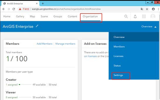 (1)在浏览器以初始管理员账户登录到 Portal,点击‘Organization’,再点击‘Settings