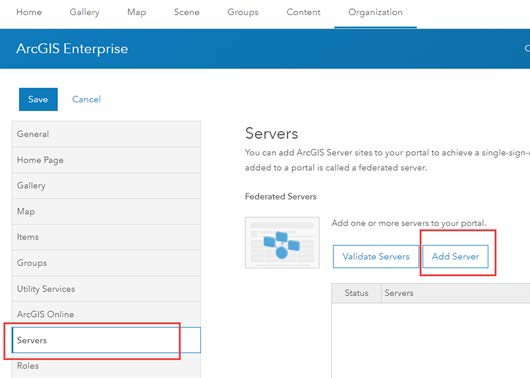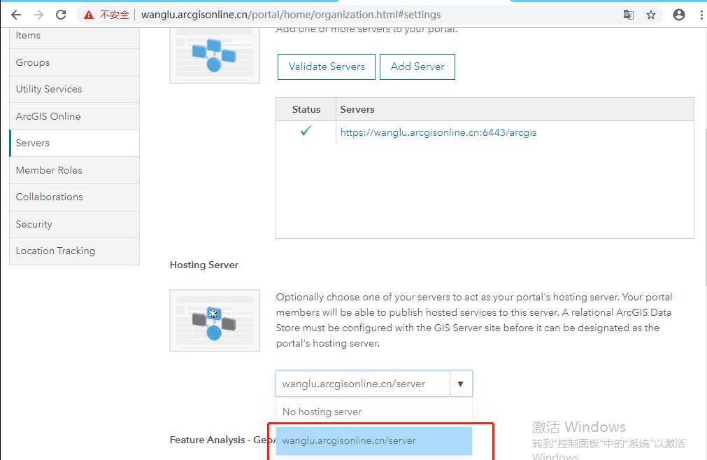 (4)设置托管服务器在 Hosting Server 下面有个下拉框,选择一个联合的 Server(一个 Portal 门户可以联合多个 ArcGIS Server,但只能把一个 Server 设为托管服务器),然后点击‘Save’才能真正进行设置