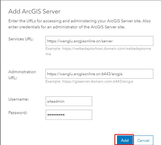 (3)输入 Services URL(注意 webadaptorname,是前面为配置 ArcGIS Server 时安装的 Web Adaptor 的名字)和 Administration URL(注意地址的最后是固定的 arcgis 这个单词),和 ArcGIS Server 主站点的管理员用户名和密码,点击 Add