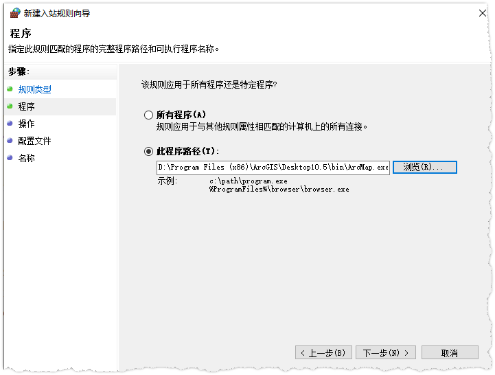如果实在觉得端口太多,不好配置,直接让应用程序穿过防火墙吧,如ArcGIS Server程序位置,将其加入出站和入站程序: